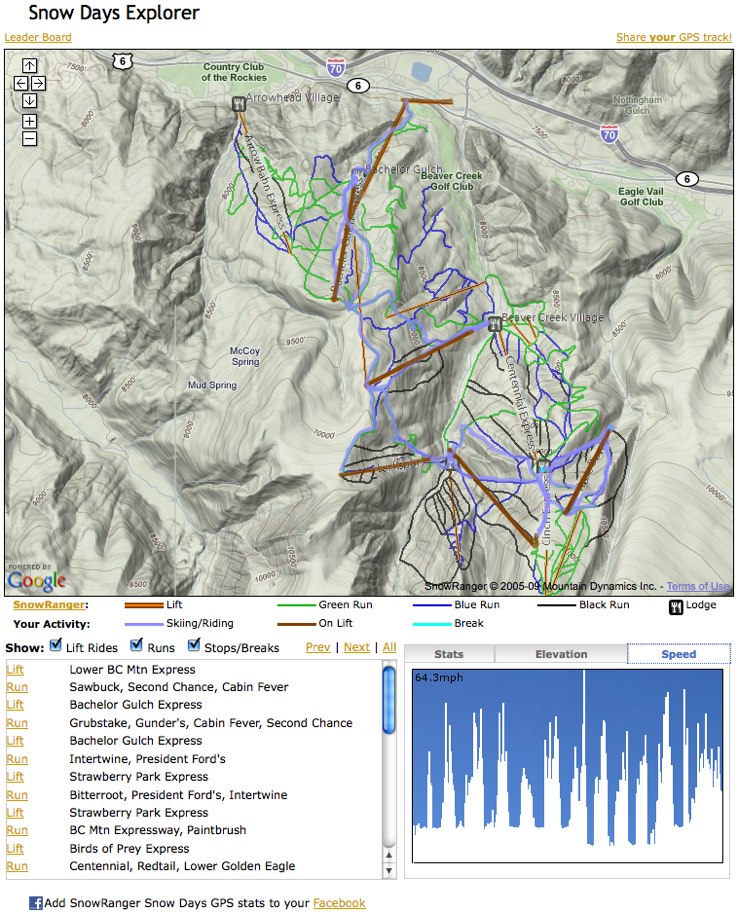 In addition to finding your realtime position on the mountain, you are able to store your tracks and later upload them for sharing on the internet using the unique "Snowdays" tool. There is even a Facebook group where you can share and compare your day's skiing or boarding! The image below is taken from a Snowdays record, and we think it's pretty cool!