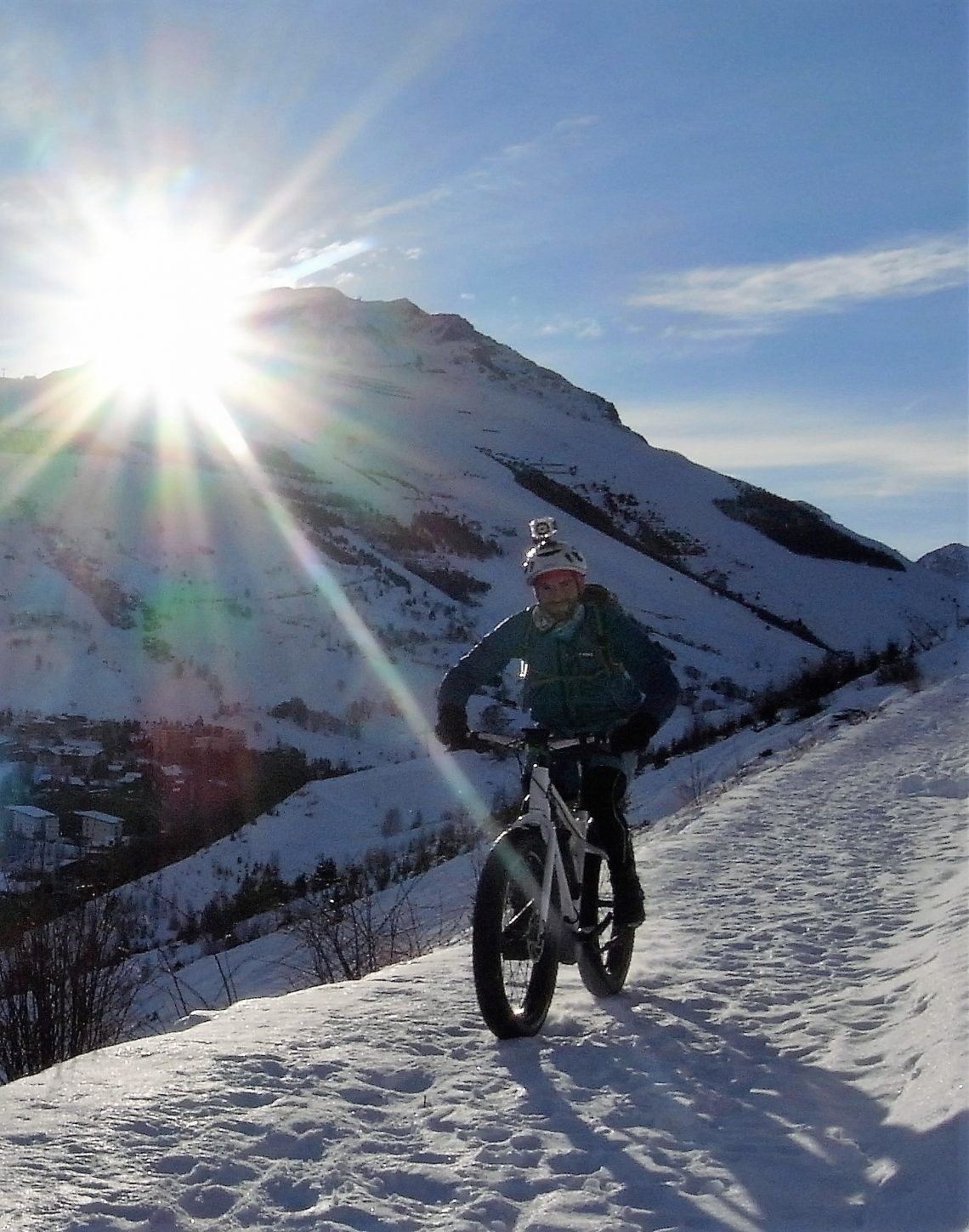 I’m riding with Sylvain Marulaz, an ‘Accompagnateur en Montagne’ who, after guiding mountain bikers around the superb range of trails at Les Deux Alpes in summers decided to combine the upsurge in popularity in fat bikes and electric bikes to offer a winter version of the same thing.