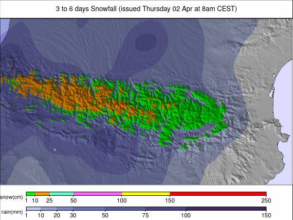 Most areas saw 2–5cm (1–2"), although some locations recorded up to 20cm (8") in 24 hours. Grandvalira reported a 36cm (15") snowfall on Sunday. Despite approaching the end of the season, base depths remain exceptional, with many resorts still reporting over 3m of snow on higher slopes.