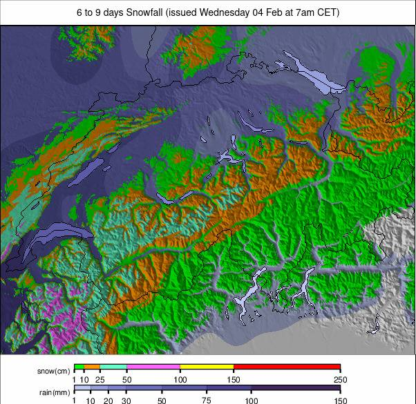 Continuing unsettled with more areas set to see more moderate snowfall as fronts move through, with temperatures remaining very cold. The next few days will be largely dry, with temperatures down to -15°C, but snowfall is expected on Thursday/Friday, followed by potentially heavier accumulations at the weekend. High alpine slopes stay reliably wintry, while low valleys see freeze–thaw cycles before temperatures fall again.