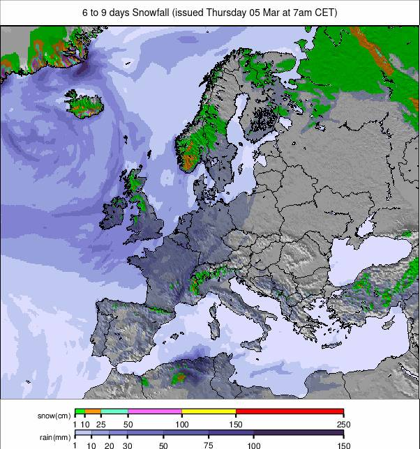 At more southerly, coastal resorts like Voss, the milder weather has brought sleet at times as well as snow. Western Norway has, though, seen the best of Europe's snowfall this week, with 7-day totals of 30–60cm (1–2 feet) for some.