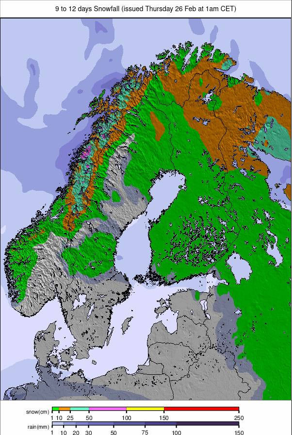 Temperatures have moderated slightly to between –5°C and –15°C, though –30°C was recorded in Lapland at the weekend. Snow showers have delivered 10–20cm (4–8") top-ups, with Røldal in Norway reporting 25cm (10”) overnight Monday.