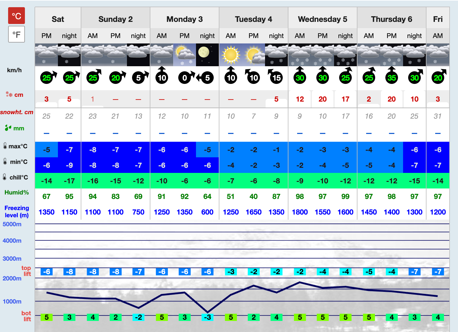 Further snowfall and cold temperatures are expected for the rest of this week, with ski areas in Alberta and British Columbia forecast to receive moderate to heavy snow midweek, with temperatures dipping to –15 °C at higher elevations. Snowfall will intensify on Thursday and Friday, with freezing levels staying low, supporting excellent early-season conditions. Winds will be moderate, but visibility will inevitably vary during heavier flurries.
