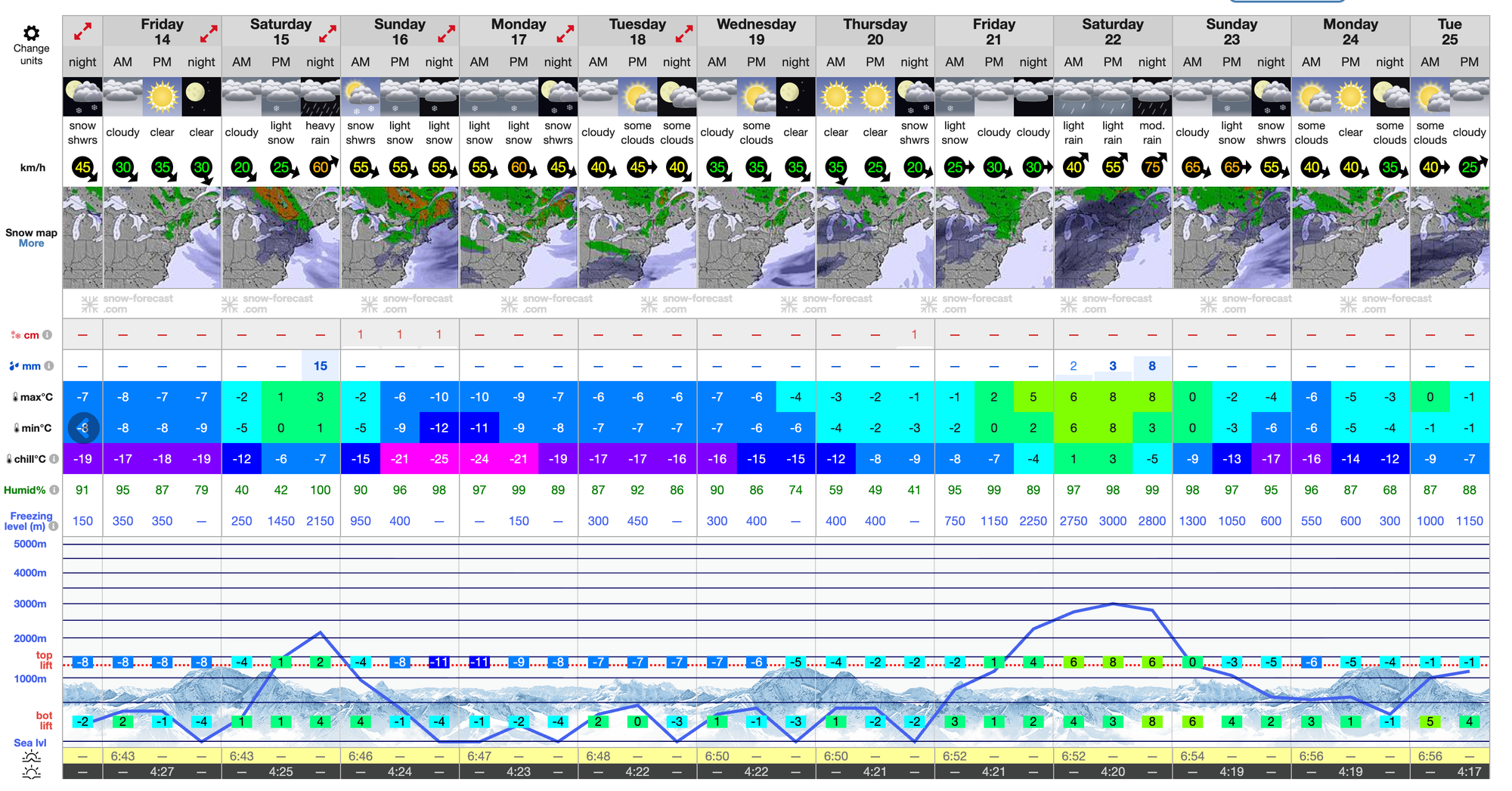 A mix of light snow and colder air will persist across Vermont, New Hampshire, and Maine through the rest of this week. Conditions will be typical of early-season snowfall, with temperatures dipping below freezing at higher elevations. Snowmaking conditions will remain favourable, though natural accumulation may be modest. Winds will be light to moderate, and freezing levels will remain low enough to support base-building.