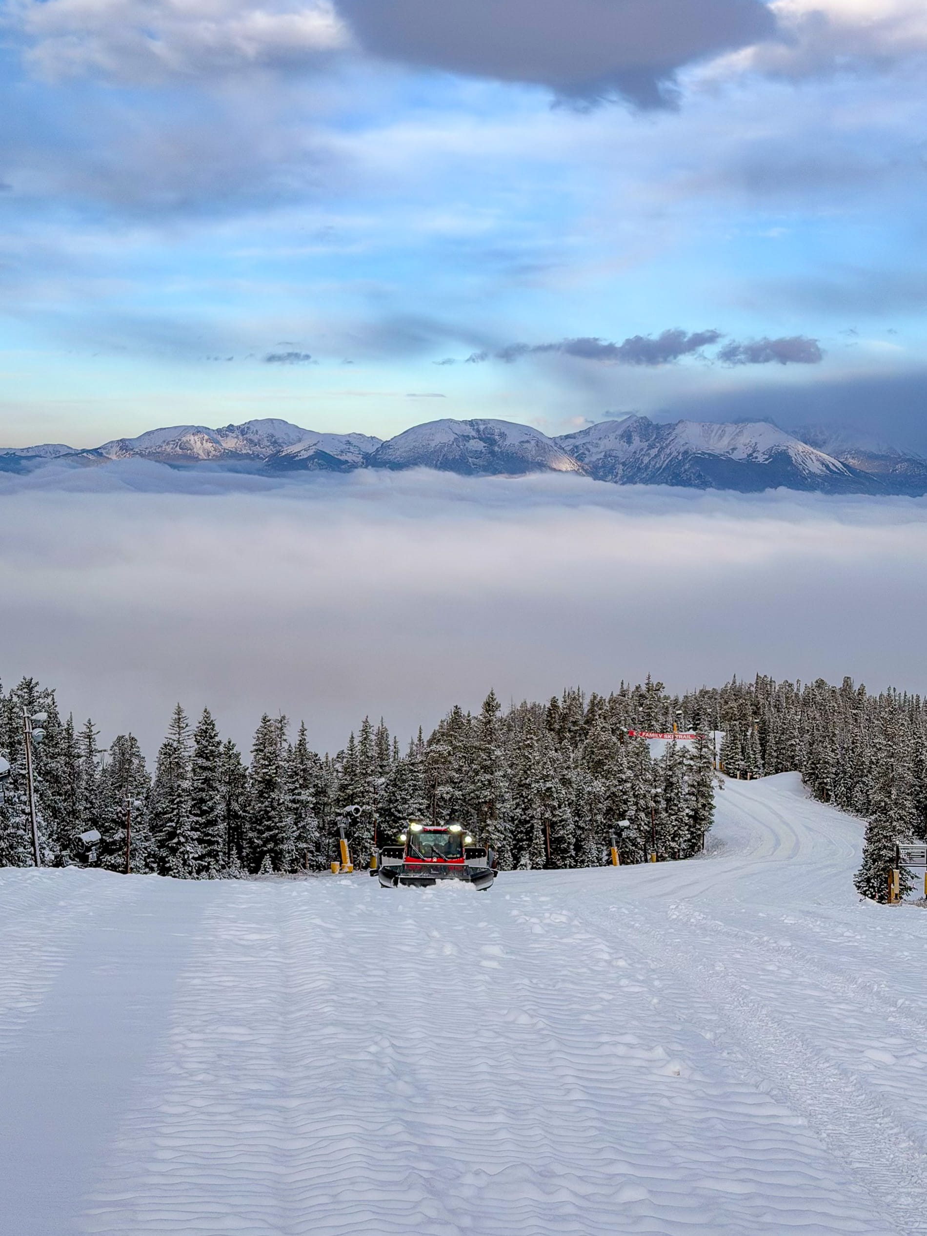 It was a surprise then that no one announced a Saturday opening by Friday night, but Keystone (0/12” / 0/30 cm) made its 3 pm move as soon as Arapahoe Basin (2/12” / 5/30 cm) said they were open on Sunday. This unusual start to the season saw Keystone opening the Schoolmarm and Silver Spoon trails for three hours until 6 pm, finishing under the resort’s famous floodlights. Keystone always aims to open with at least two miles of runs, and 2025 was no exception. Its Opening Day also featured a hike-to terrain park under snowcat-lit conditions, a live DJ, and $5.50 beers and hot dogs to celebrate the resort’s 55th season. Terrain is accessed via the River Run Gondola, with laps off the Montezuma Express lift; skiers download back to base at day’s end.