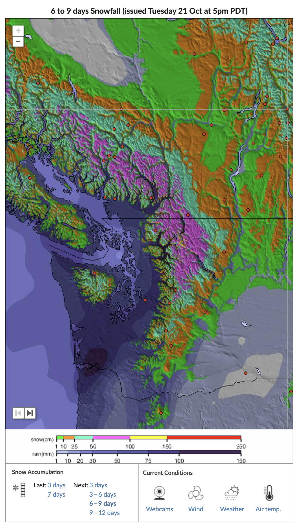 A weak La Niña signal is beginning to take shape, favouring cooler, wetter conditions across British Columbia and the Pacific Northwest. Freezing levels will drop to around 1,500–1,800 metres, supporting light to moderate snowfall midweek, especially over higher terrain in coastal and interior BC.