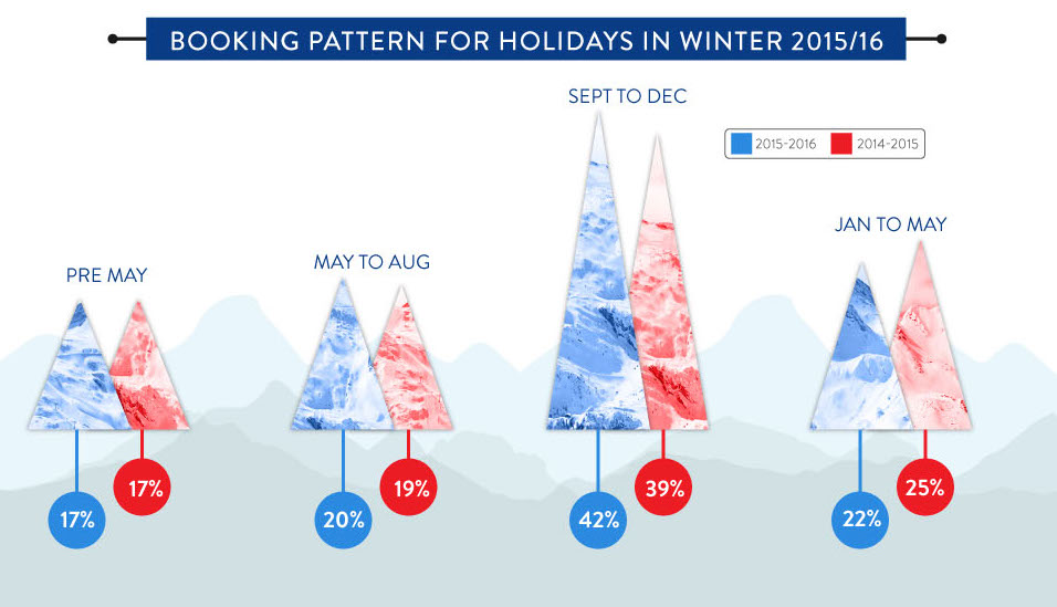 The graphic below gives an indication of ski holiday booking patterns, though in conversation with other businesses in the industry, there’s a steady increase in late booking, DIY trips.
