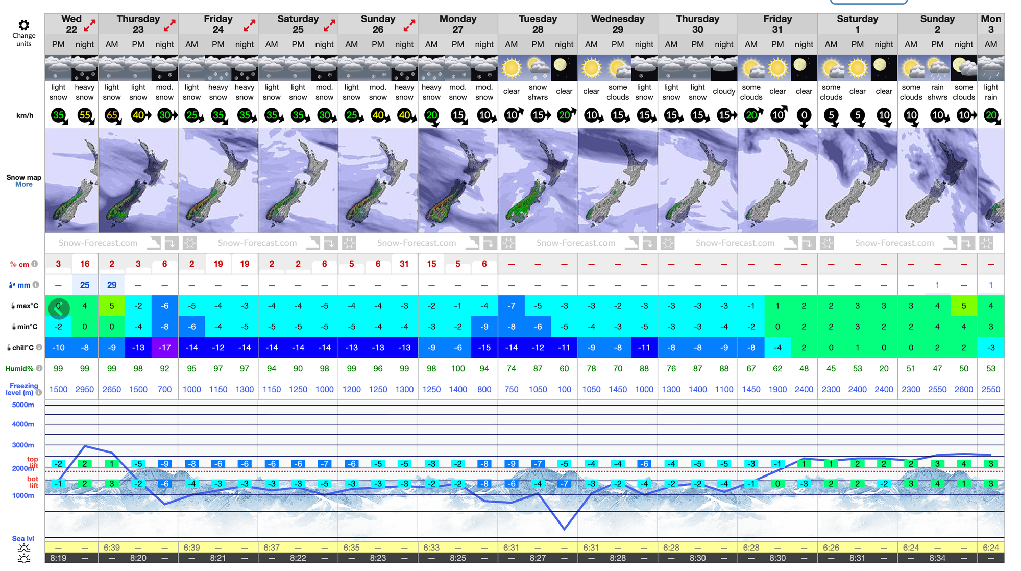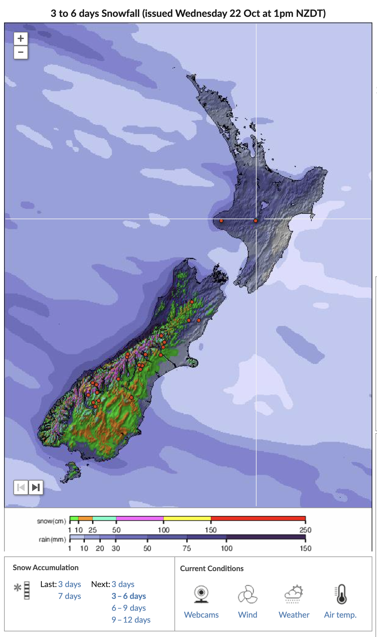 At Whakapapa, the spring thaw persists under mostly cloudy skies. Temperatures will remain between 0°C and 12°C, with a brief chance of light snow flurries at altitude on Thursday and Friday. Winds will increase midweek, but no significant snowfall is expected before the season concludes. Nearby Turoa similarly reflects this pattern, with variable cloud cover and mild daytime highs around 10–12°c. Although the snowpack remains thin, a dusting of snow may appear on the upper slopes later in the week.