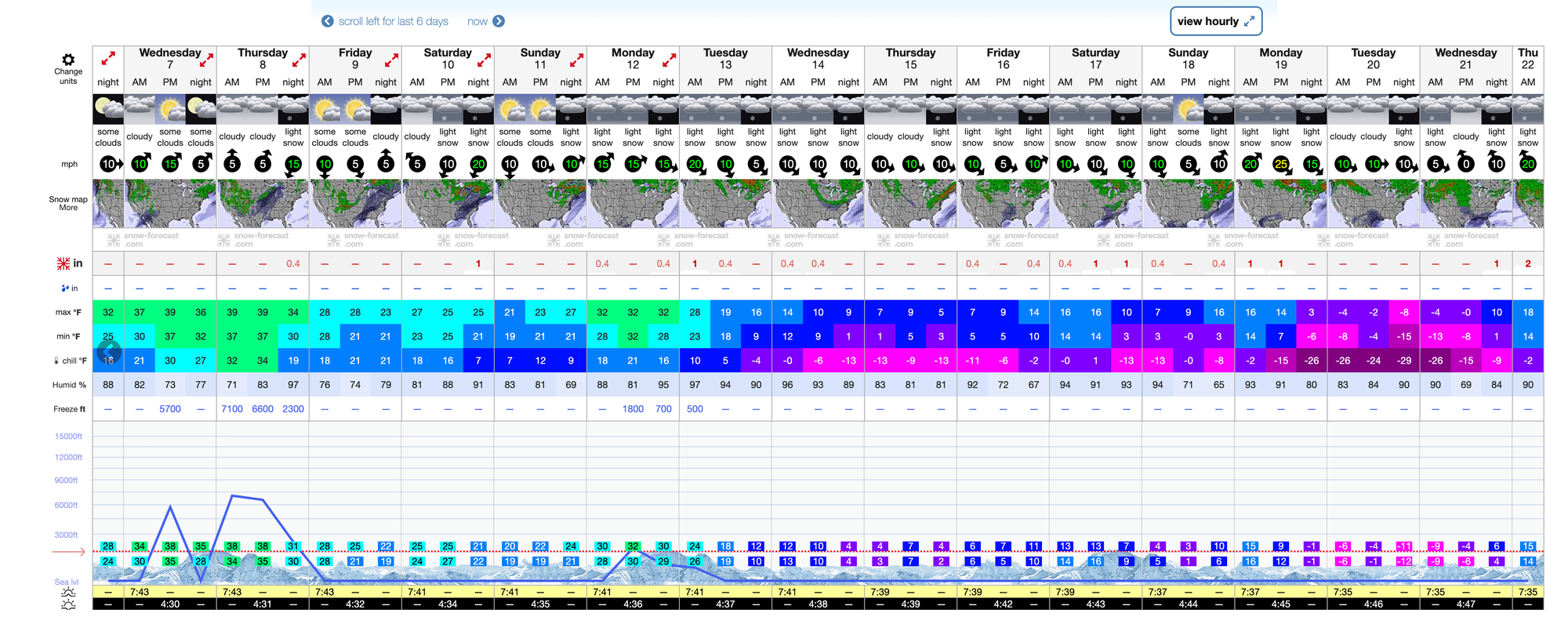 Alas, further milder, generally drier weather is favored across much of the Rockies for the remainder of this week, with continuing above‑normal temperatures likely in Colorado, Wyoming, Utah and Montana. This limits widespread storm activity, though higher elevations may still see occasional light snow. That said, two systems should bring light to moderate snowfall to Wyoming, Utah and Colorado through January 12. Base temperatures trend towards freezing, while upper‑mountain readings stay well below, especially overnight. Winds remain moderate but can strengthen along exposed ridgelines during the passage of weak fronts.